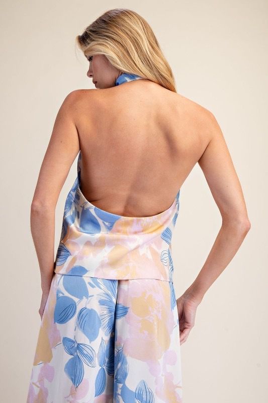 A halter top with draping back. Wear with matching trousers or your favorite jeans.