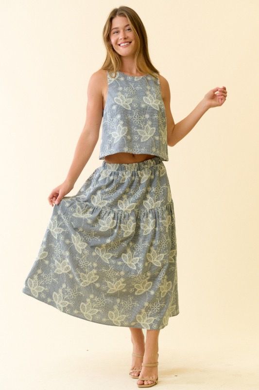 A black embroidered midi skirt with white details. Matching tank available to wear together as a set.