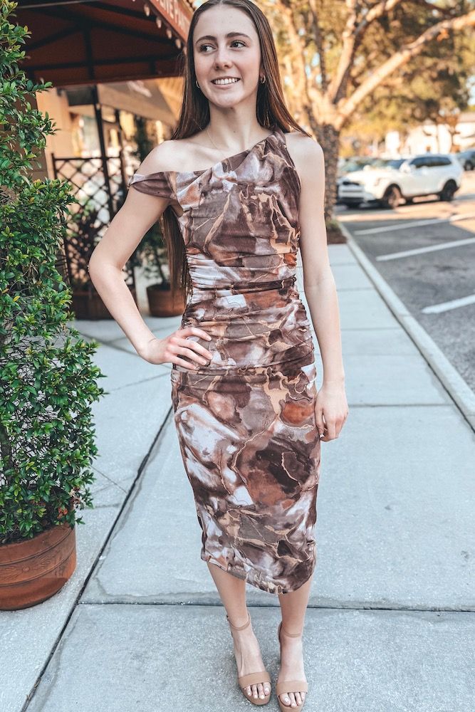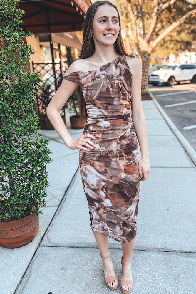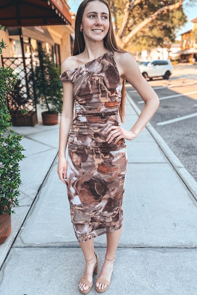 Print Twisted Shoulder Ruched Midi Dress