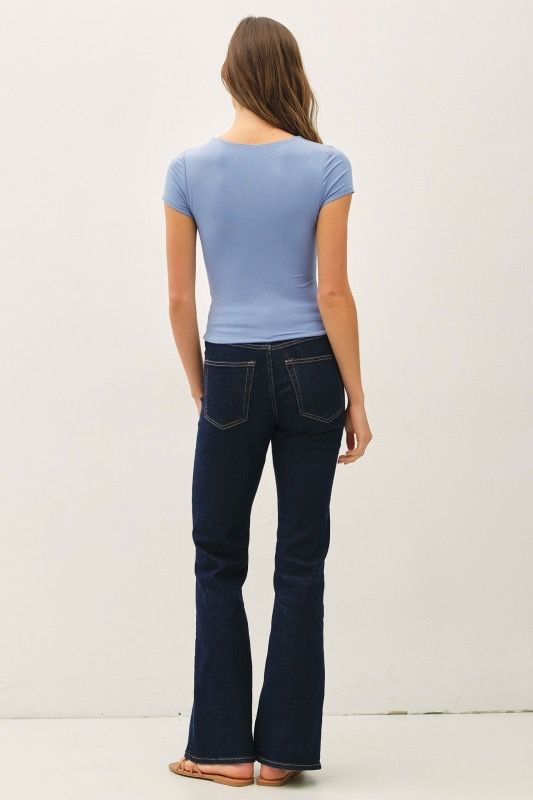 A classic bandeau swim top with a twisted fabric front and tie back closure. Fully padded- non removable.